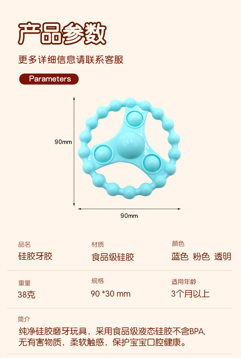 簡介:純凈硅膠磨牙玩具,采用食品級液態(tài)硅膠不含BPA,